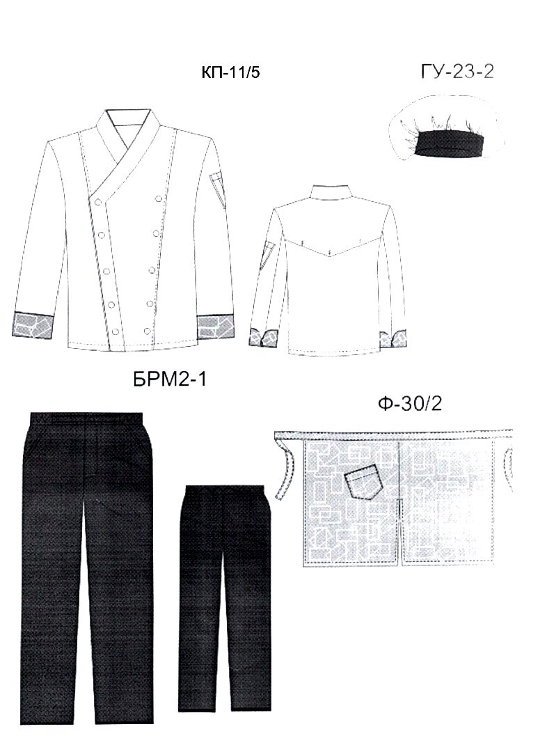 Костюм мужской шеф-повара: китель КП-11-5, брюки БРМ-2-1, фартук Ф-30-2, головной убор Pin Up ГУ-23-2