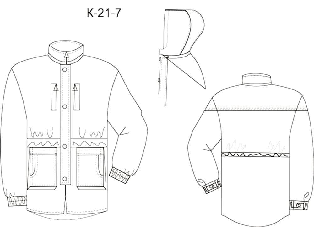 Светоотражающие и отделочные элементы: кант светоотражающий по швам кокетки полочки и спинки, рукавов, клапанов Pin Up и капюшона.